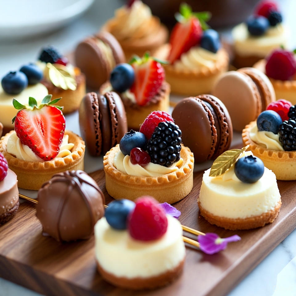• Mini Pastries: Tiny tarts, eclairs, cream puffs (chocolate, fruit, nutty, spiced)