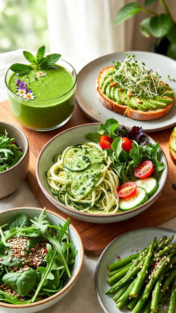 - Green Goddess Bowls: Grain/noodle bases with greens, roasted vegetables, protein, seeds, sprouts, and dressing